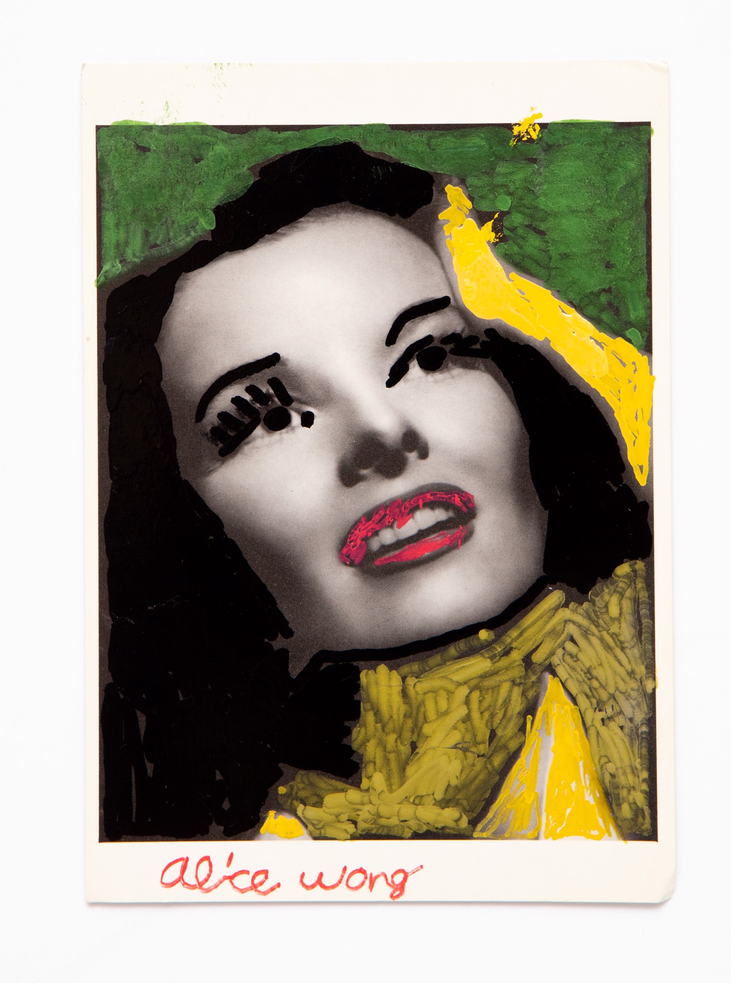 A photographic postcard image of a face with some overpainting that includes big eyelashes and red lips. | A monochromatic portrait is overpainted with vibrant yellow and green strokes, emphasizing the subject's outfit and the background, with thick black lines accentuating the eyebrows and hair. The subject's lips stand out in a bright red hue, and the name "alice wong" is handwritten along the bottom. |