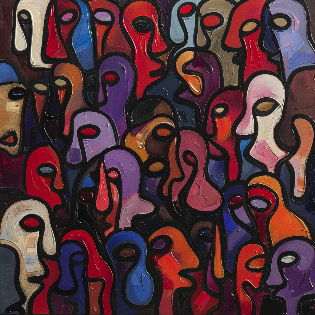 A painting of multiple figures featuring blue, orange and violet on a crimson background. | Bold, abstract figures with simplified human-like shapes fill the canvas, rendered in vibrant reds, blues, purples, and browns, outlined in black. The figures lack detailed facial features but have white spaces suggesting eyes and mouths, contributing to a crowded, colorful scene. |